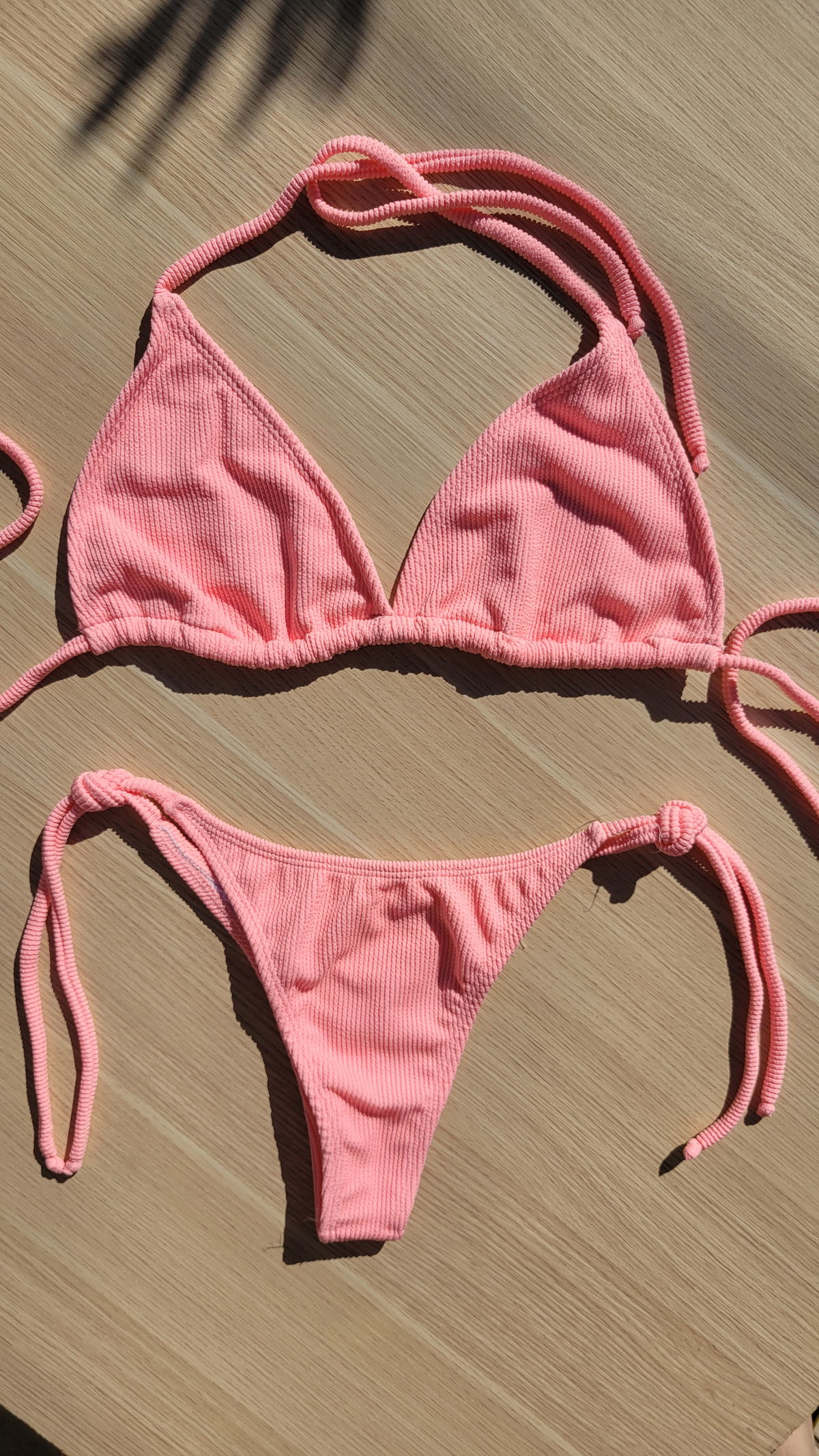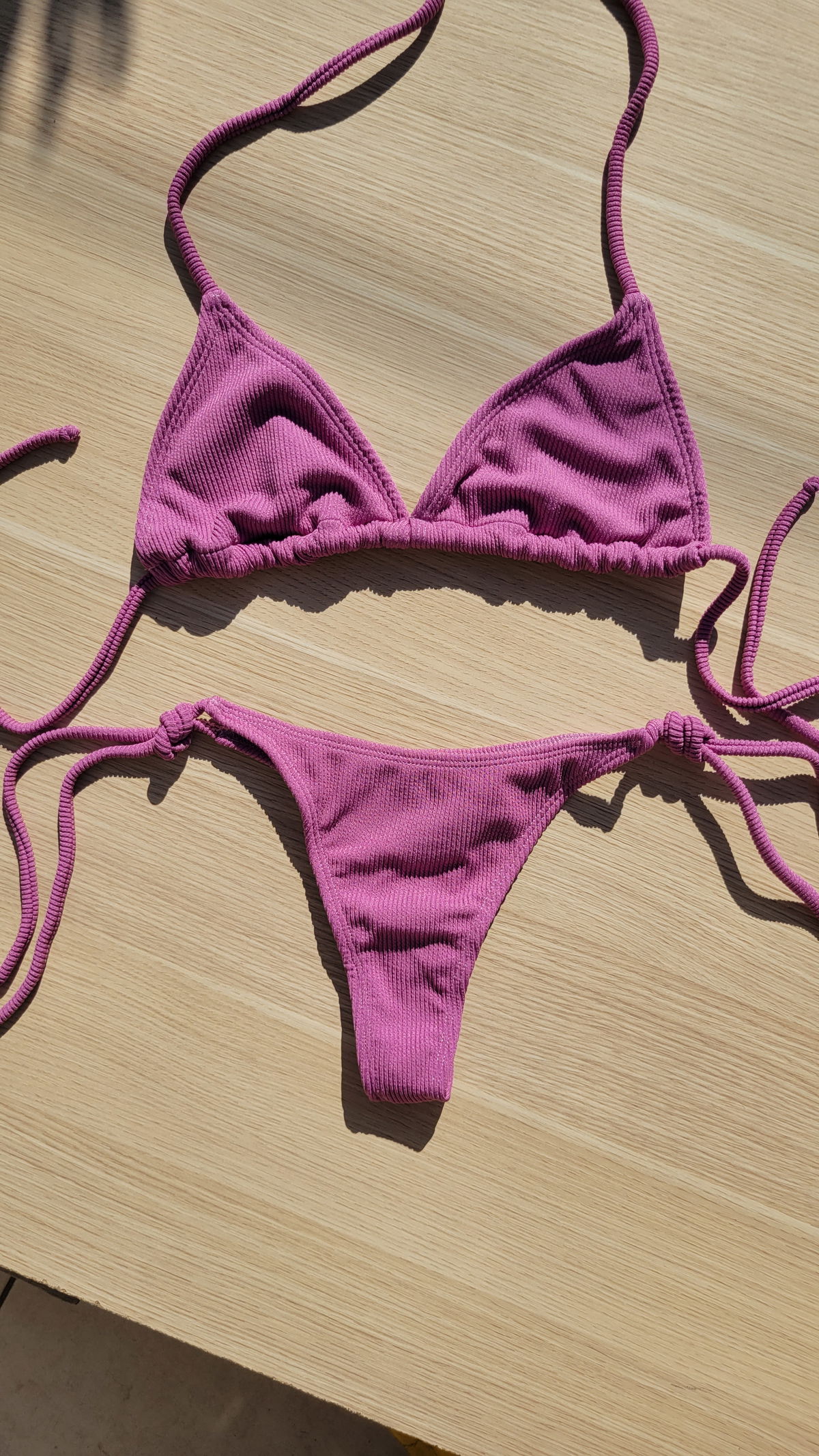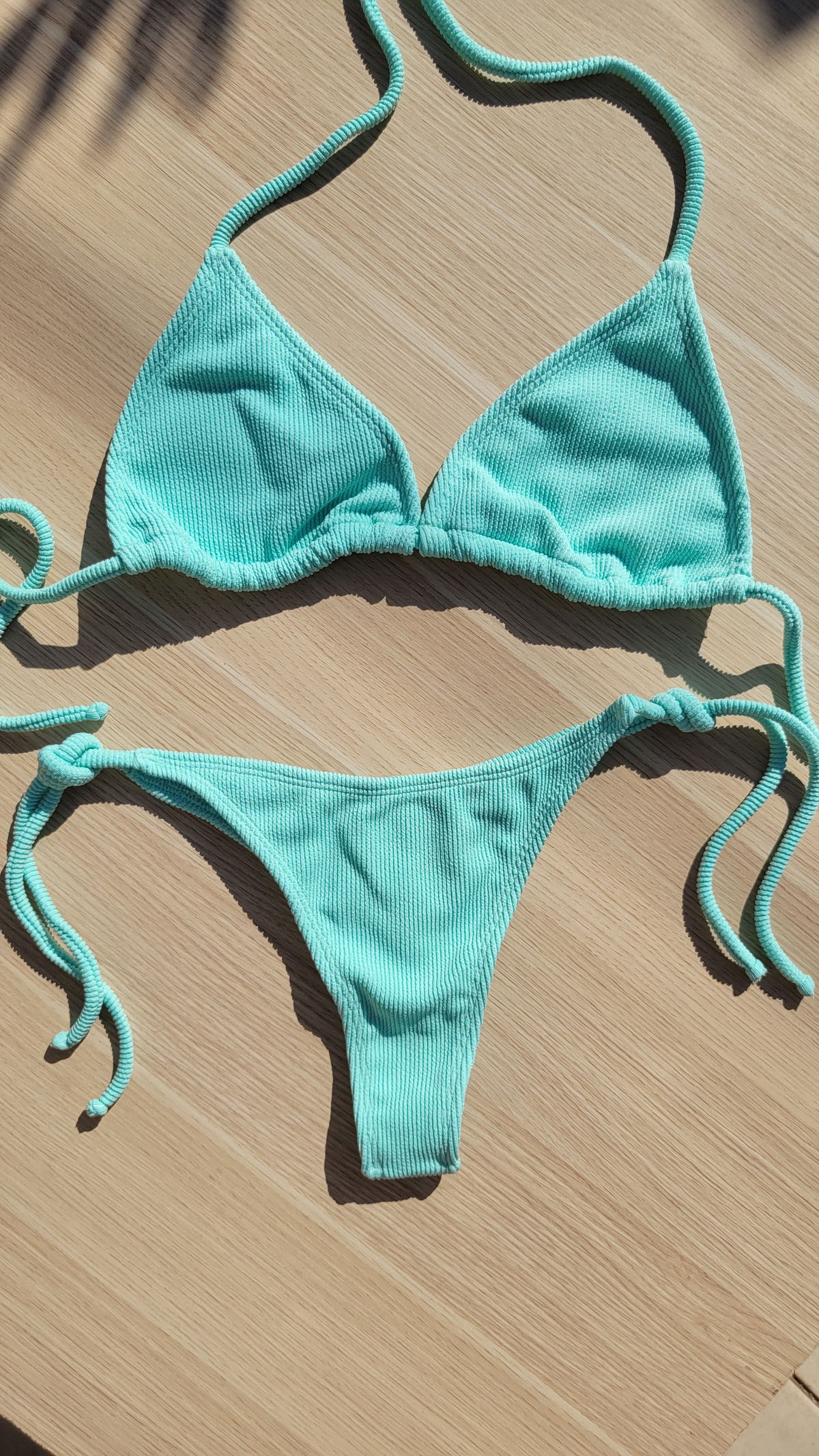 Bikini triangular con tiras regulables. Tazas amplias, cada talle abarca su siguiente. Todas las tazas tienen para poner relleno